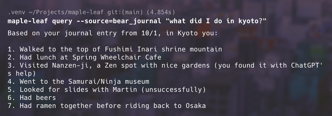 Now I’m preparing for a job search, and I wanted to shake the rust off. More specifically, I wanted to build something I’d only ever worked adjacent to: a RAG system. I’ve reviewed pull requests for RAG architectures, sat in on design sessions, and peeked at the literature. But I’d never actually built one. And in a post-LLM world where RAG feels like table stakes for anyone building AI products, I figured it was time. The result is maple-leaf — a local CLI that lets me query five years of personal journals using natural language. I named it after the Maple Leaf Rag by Scott Joplin.